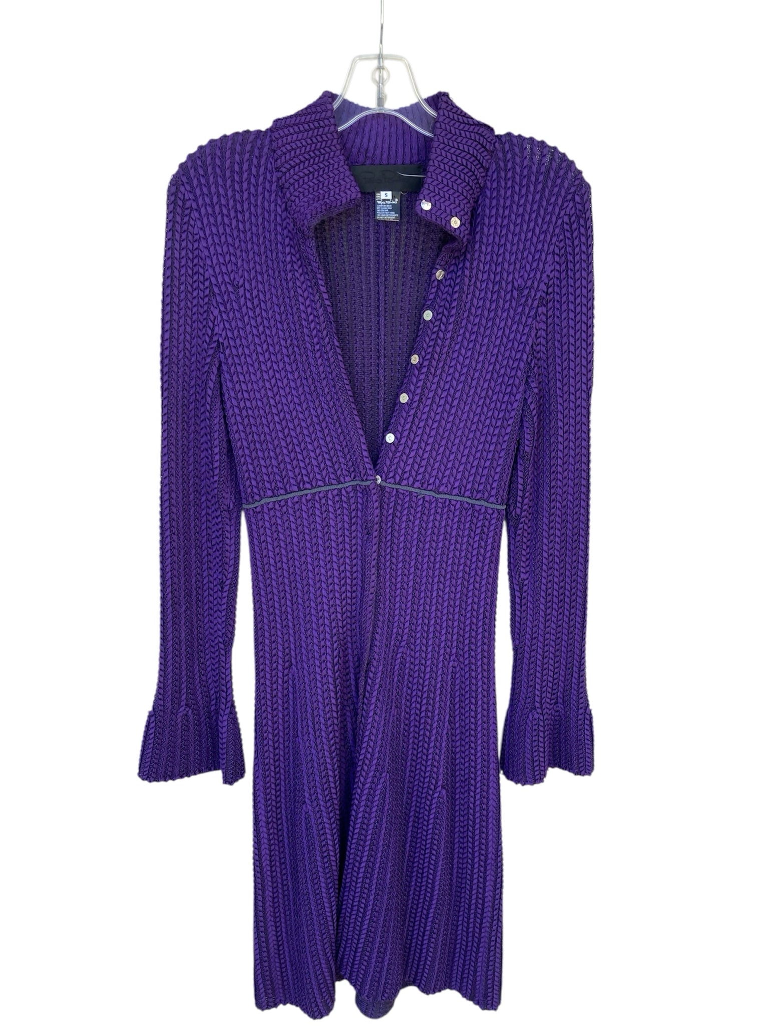 PEPA POMBO purple long sleeve button-up dress. The dress strikes a balance between classic shirt-dress elegance and contemporary refinement. It’s versatile enough for day to evening: style it with pumps for work, or ankle boots for a casual-chic look.