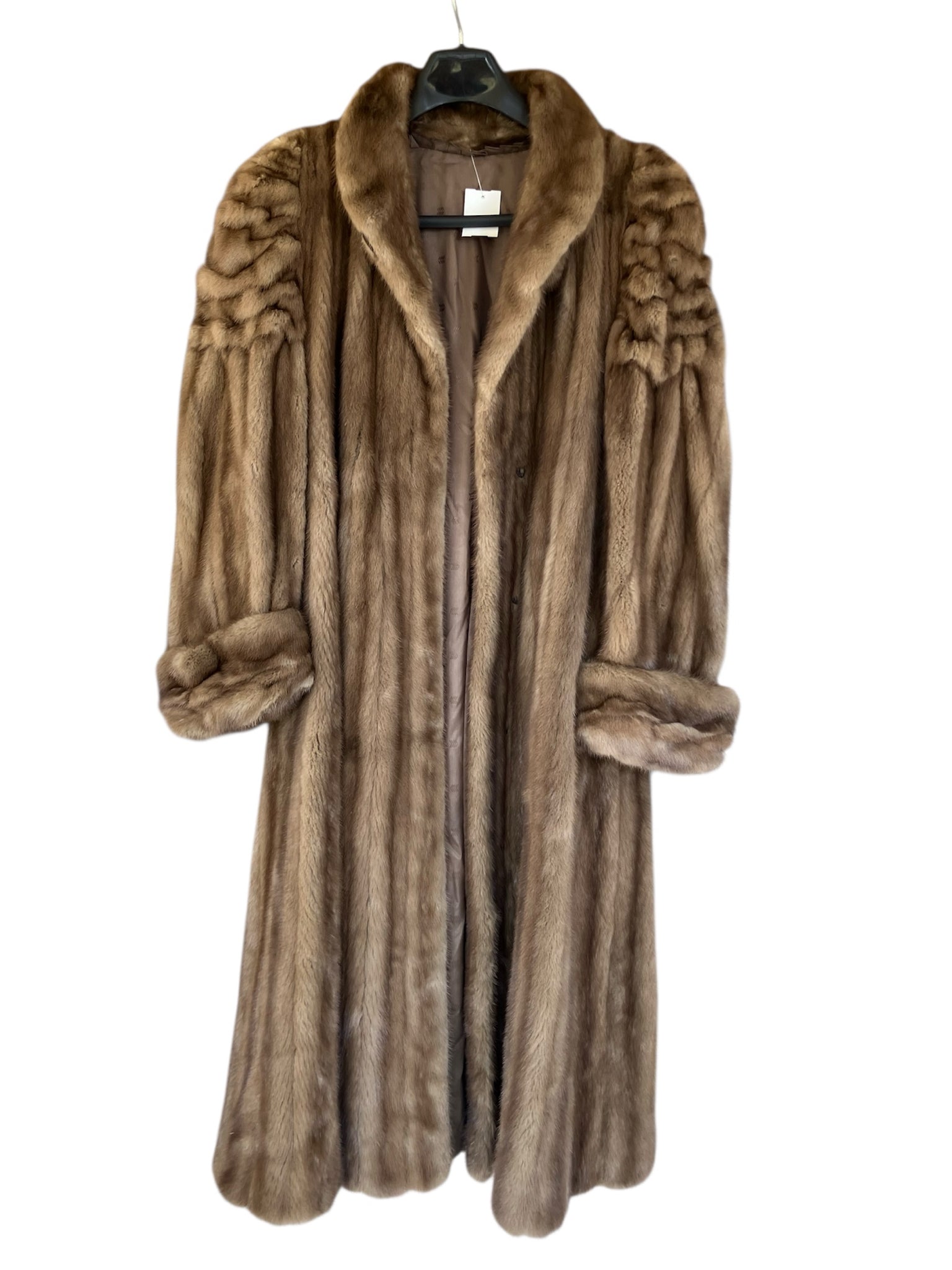 No Brand, Long Mink. The jacket is made from genuine mink pelts, prized for their dense under‑fur and glossy guard hairs that give a sleek, luxurious sheen.