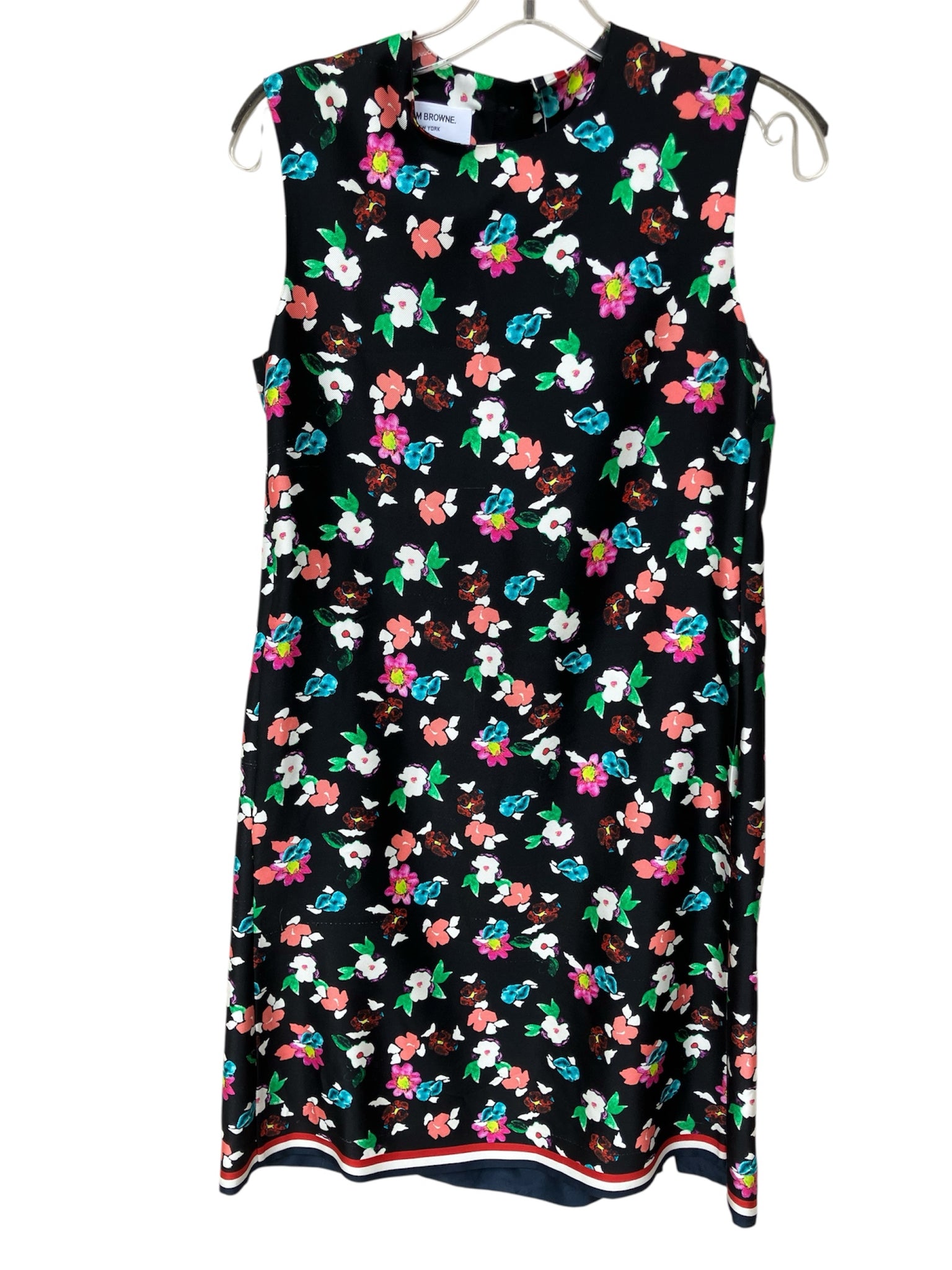 Thom Browne black floral dress. Thom Browne’s aesthetic often blends preppy tailoring and uniform-like structure with unexpected details, and this dress reflects that—architectural yet wearable, with floral jacquard elevating classic design strings.